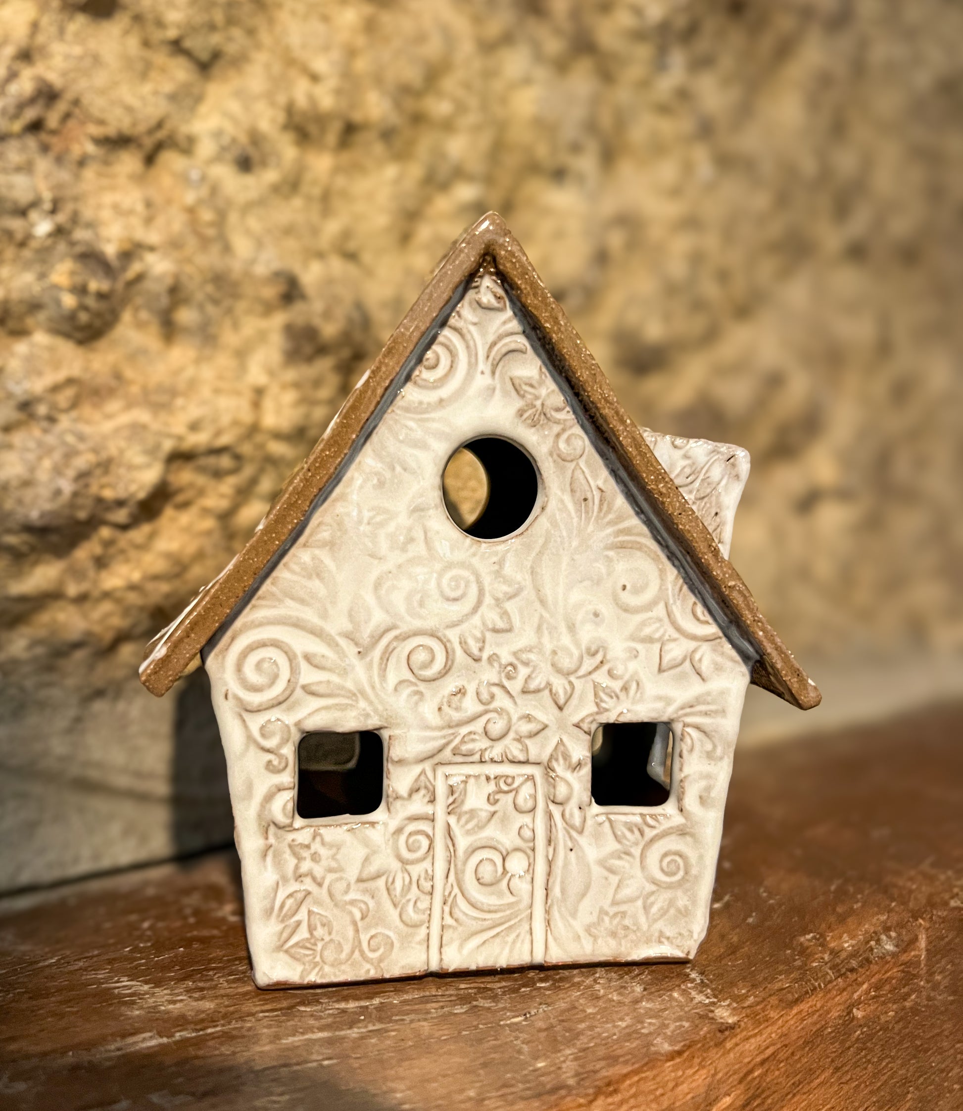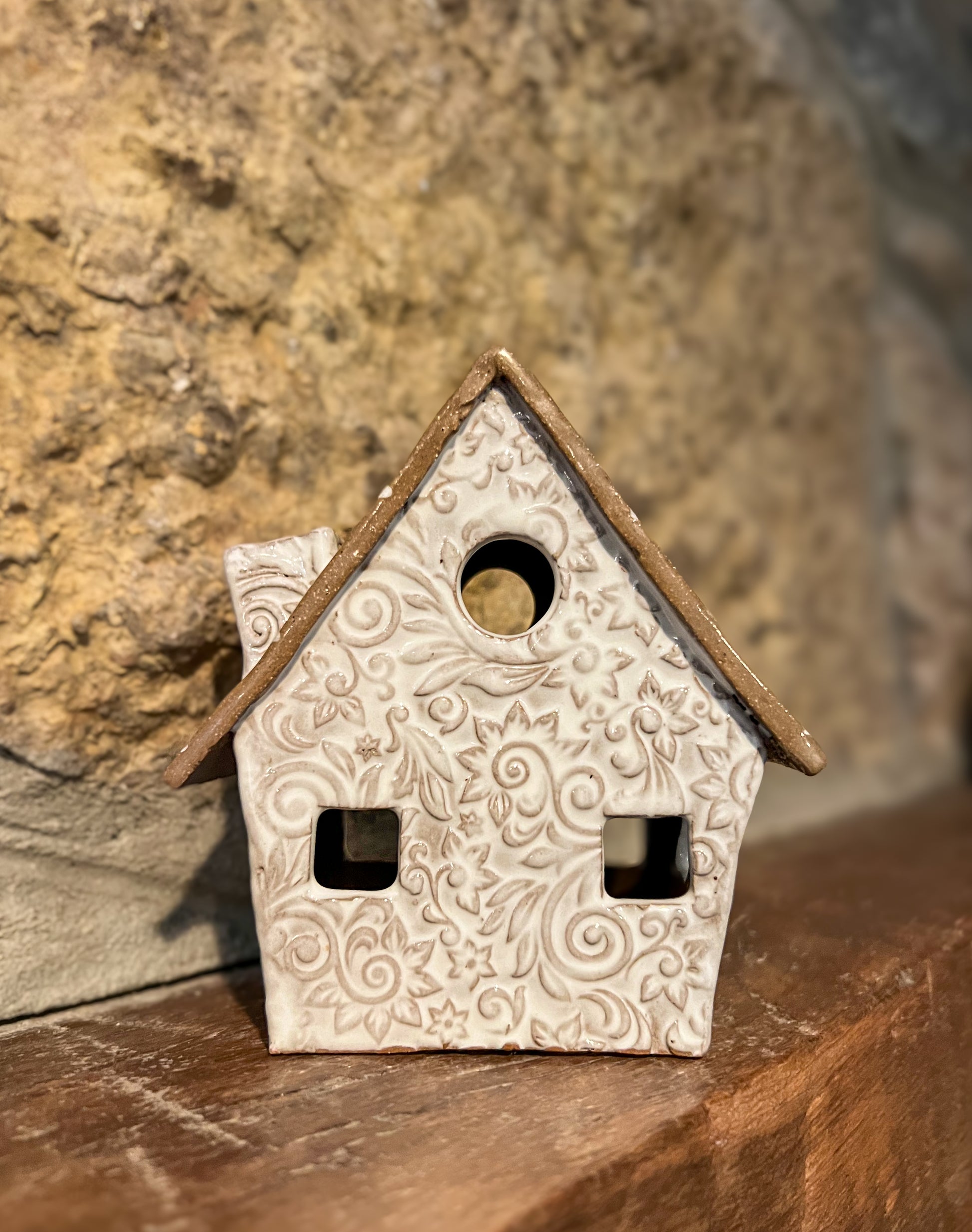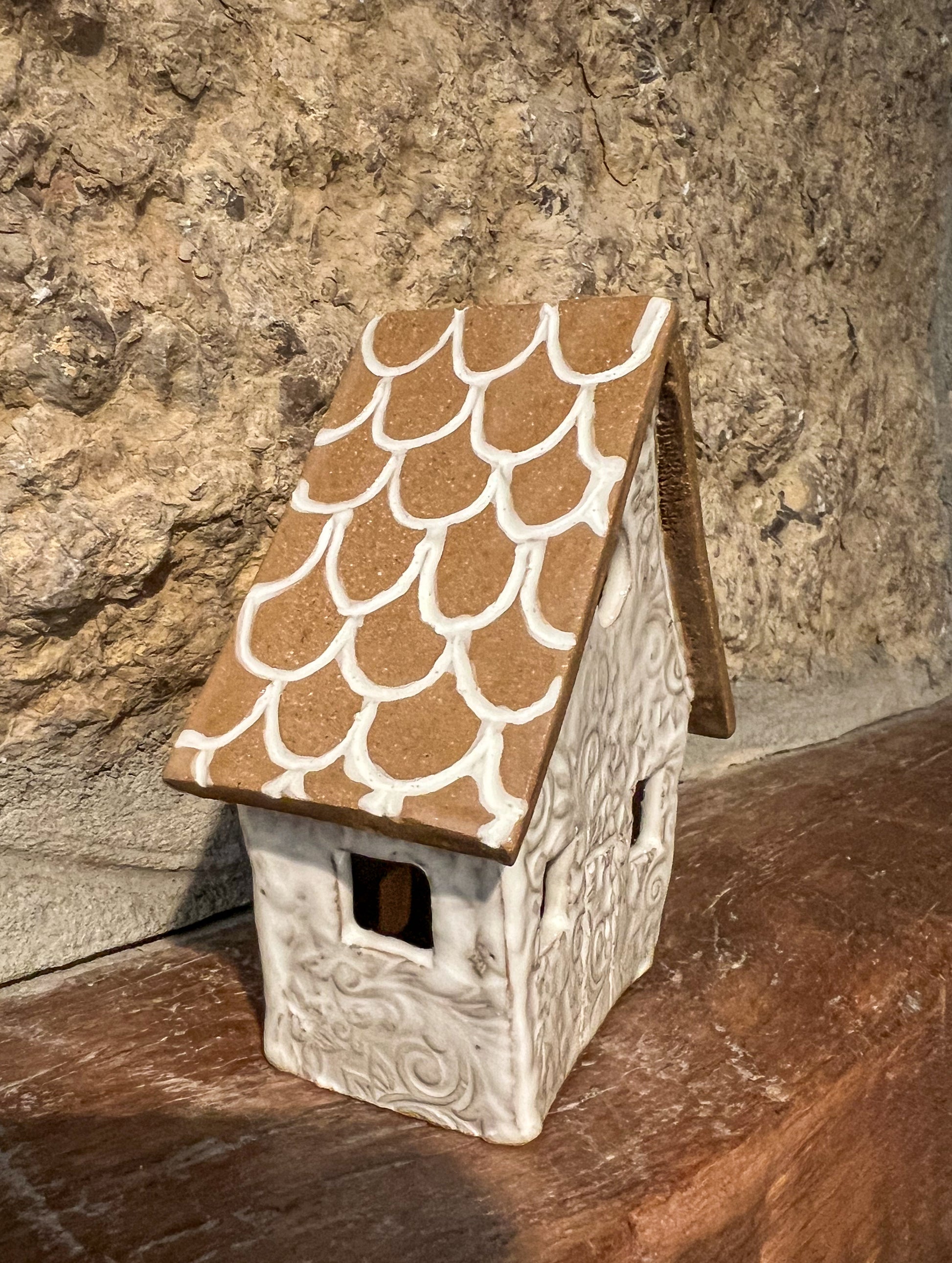 This ceramic gingerbread house is a charming decorative piece crafted to resemble a traditional gingerbread house but made from durable ceramic. It features frosting-like patterns that evoke a festive holiday spirit. It can be illuminated with LED lights and serves as a cozy and whimsical centerpiece for holiday displays or mantle decorations.