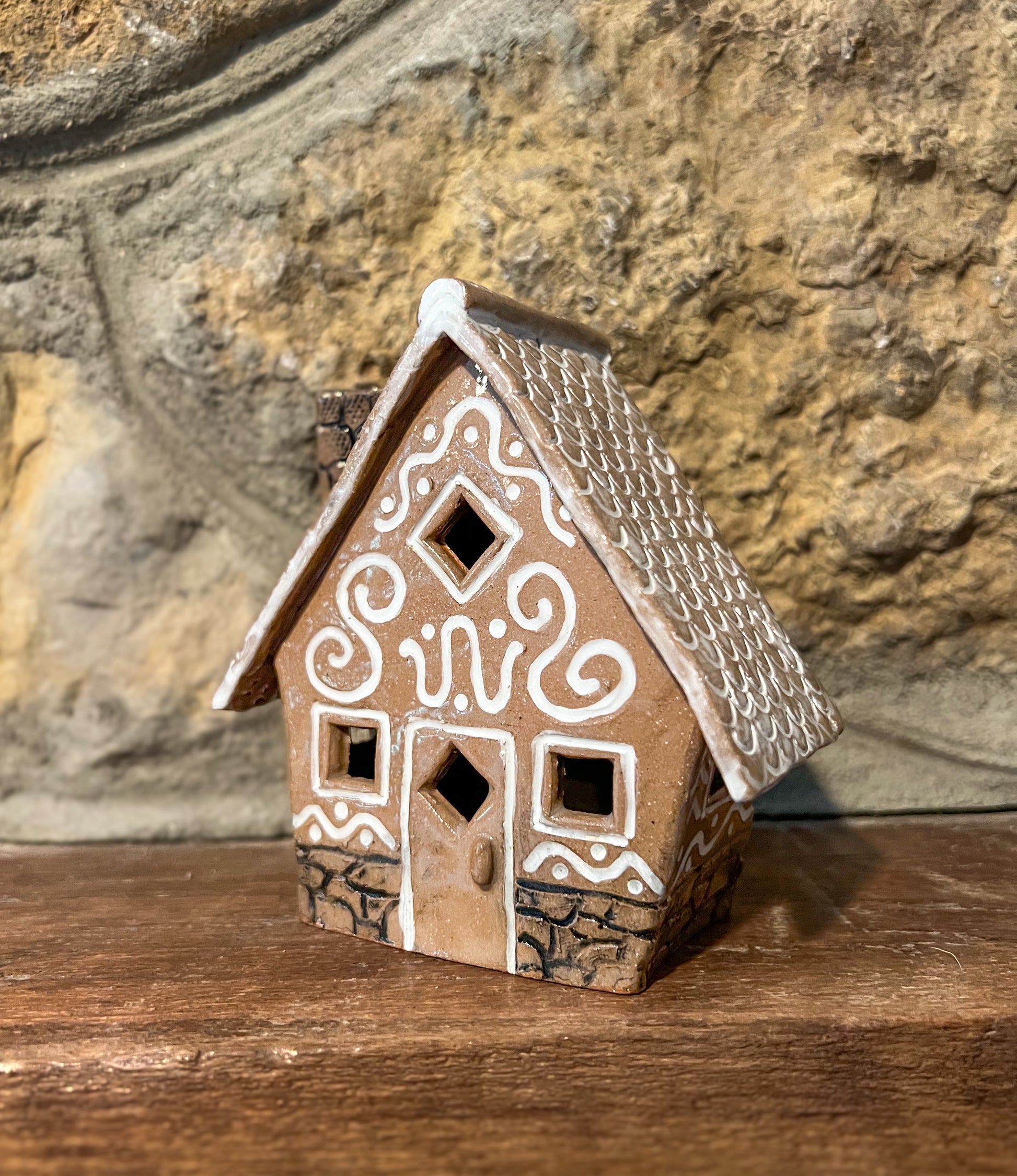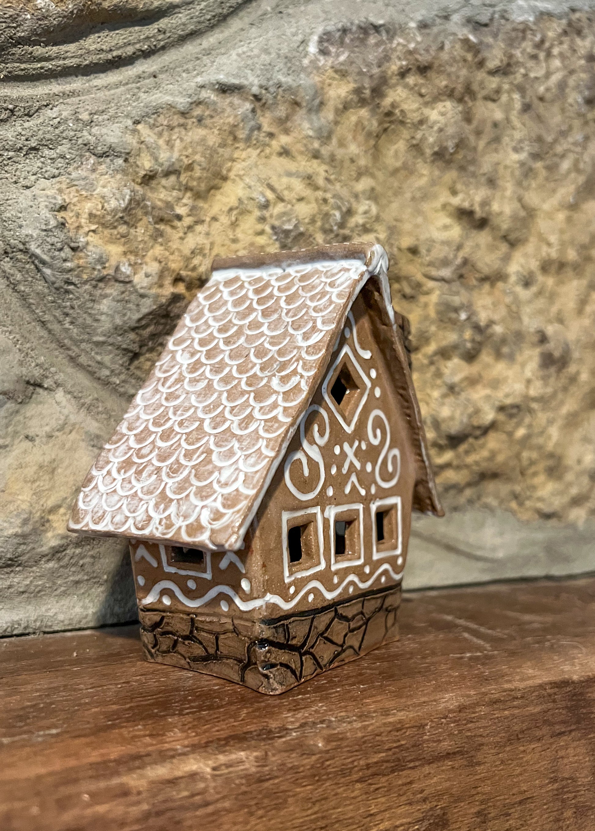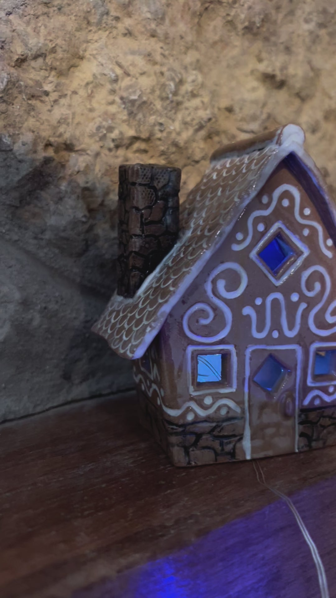 This ceramic gingerbread house is a charming decorative piece crafted to resemble a traditional gingerbread house but made from durable ceramic. It features frosting-like patterns that evoke a festive holiday spirit. It can be illuminated with LED lights and serves as a cozy and whimsical centerpiece for holiday displays or mantle decorations.
