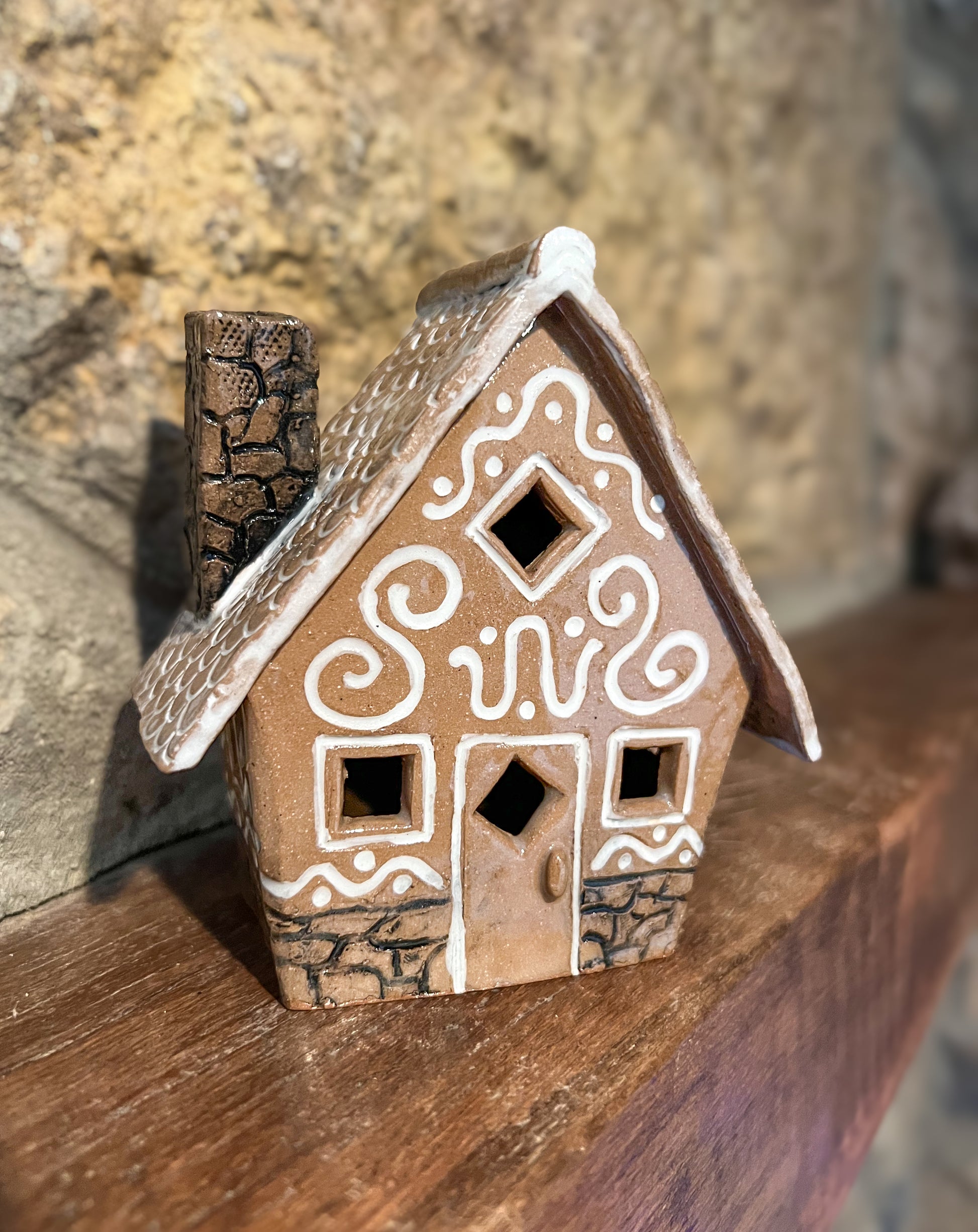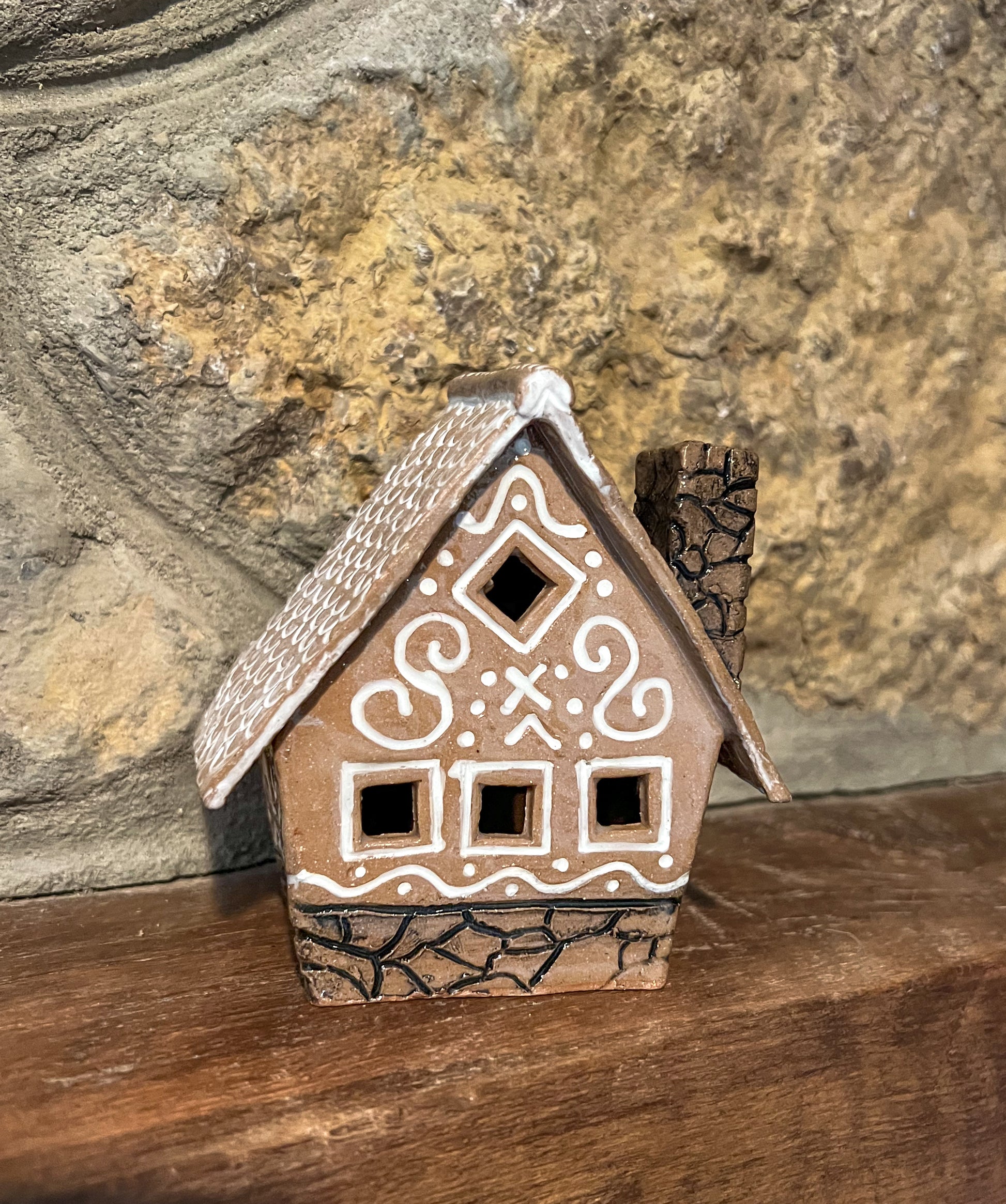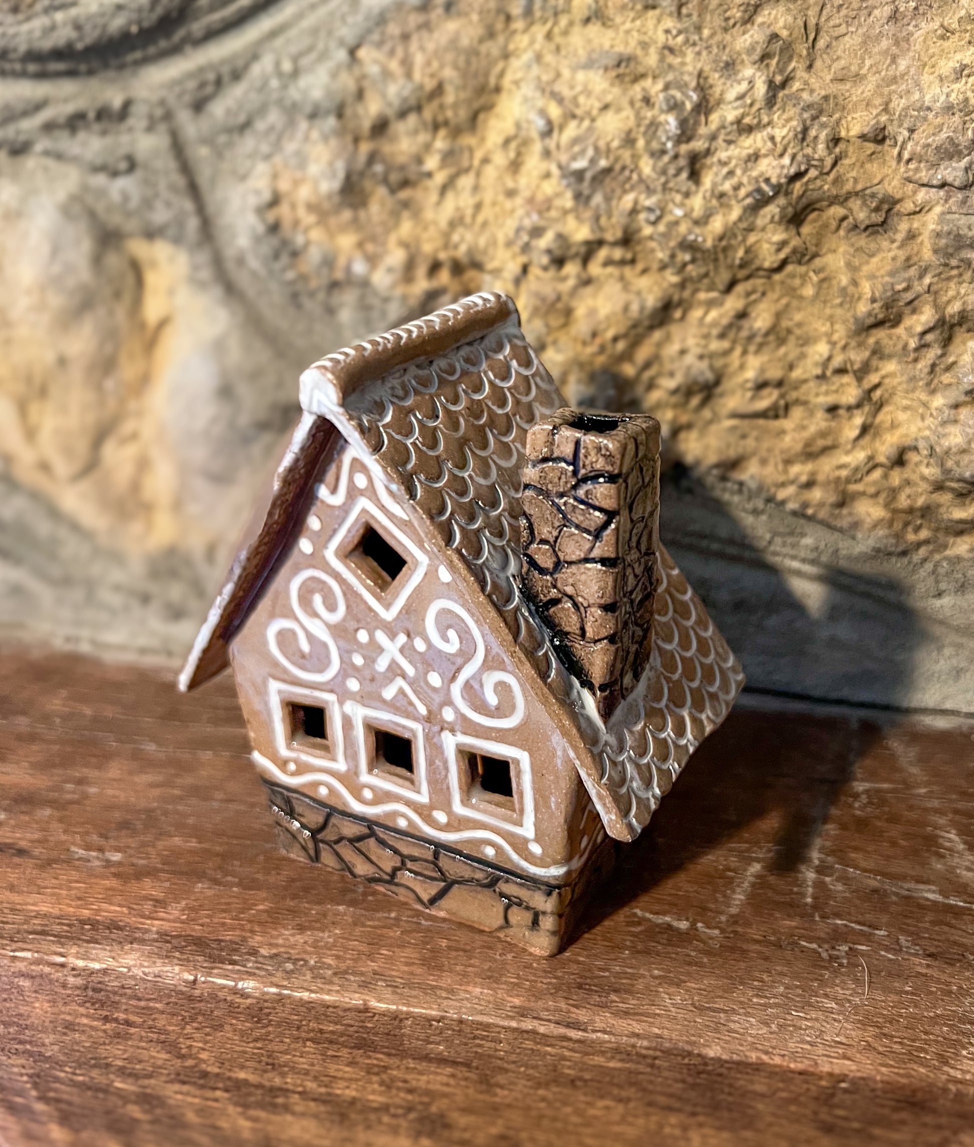 This ceramic gingerbread house is a charming decorative piece crafted to resemble a traditional gingerbread house but made from durable ceramic. It features frosting-like patterns that evoke a festive holiday spirit. It can be illuminated with LED lights and serves as a cozy and whimsical centerpiece for holiday displays or mantle decorations.