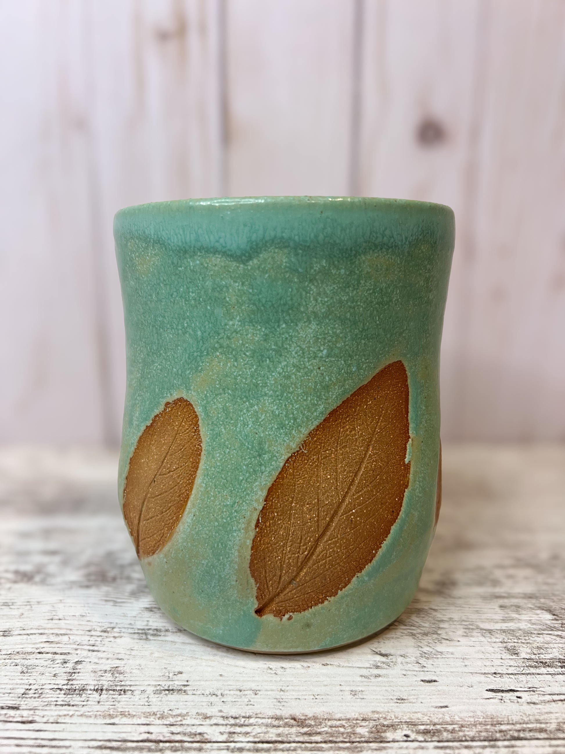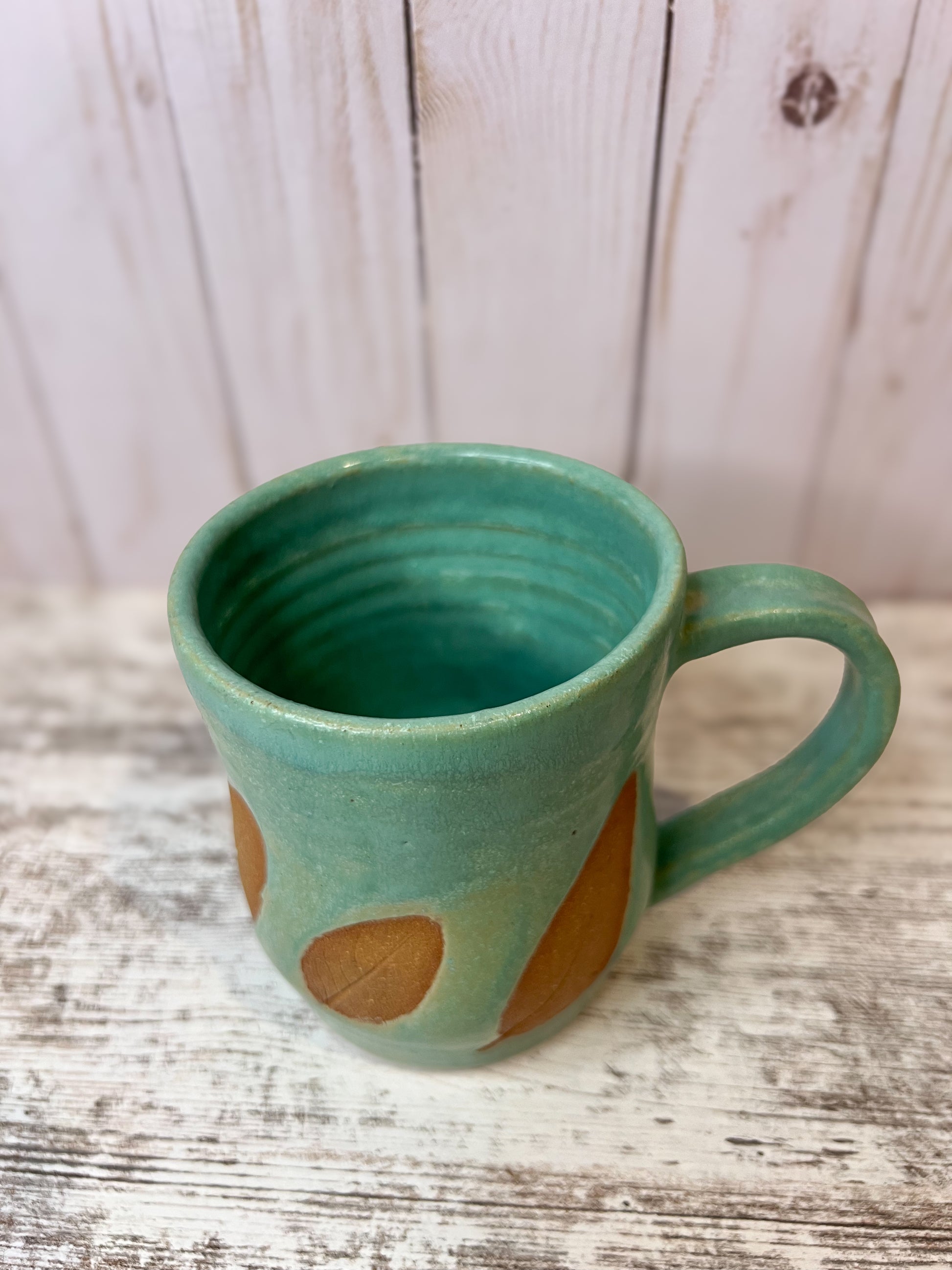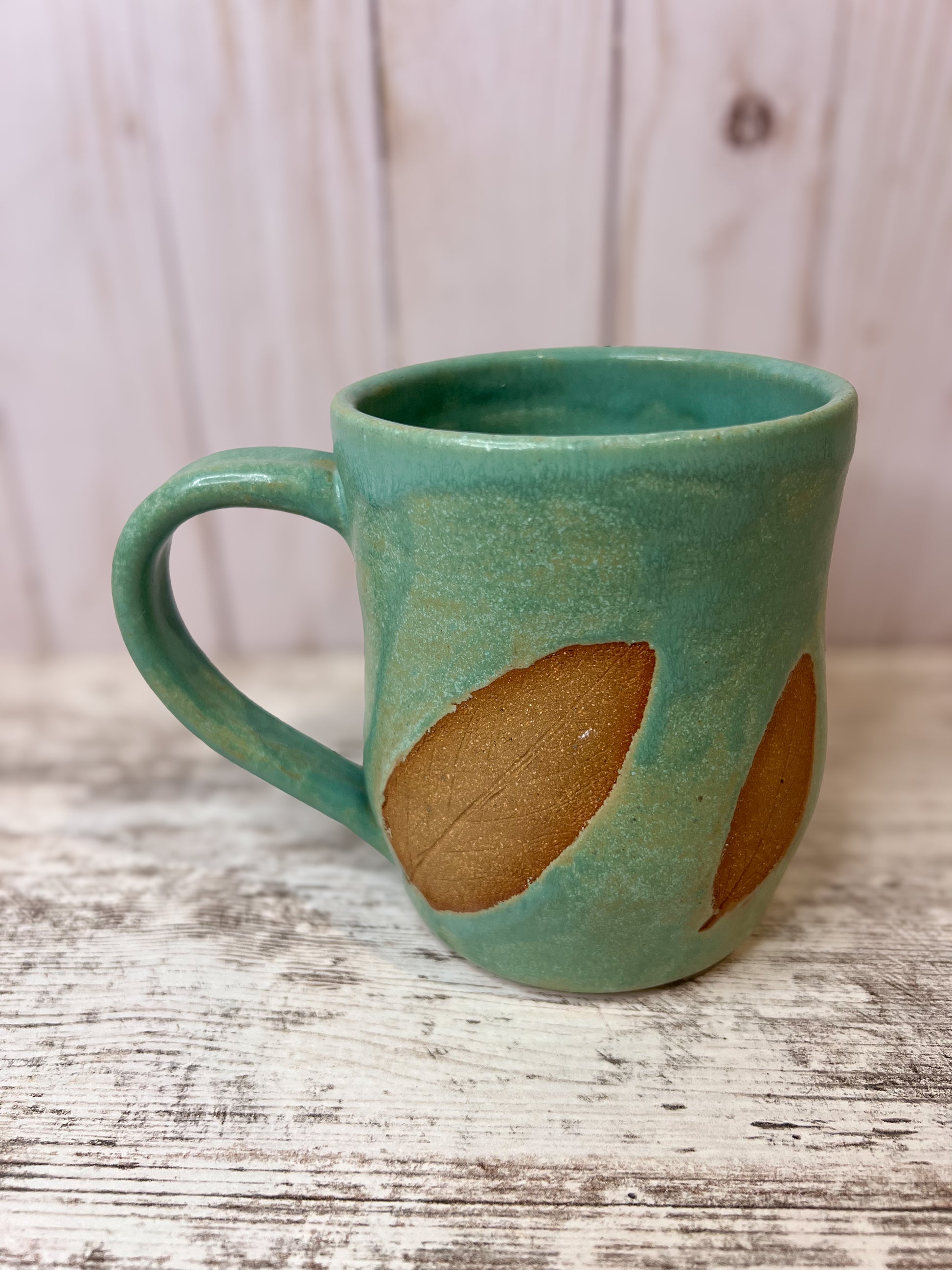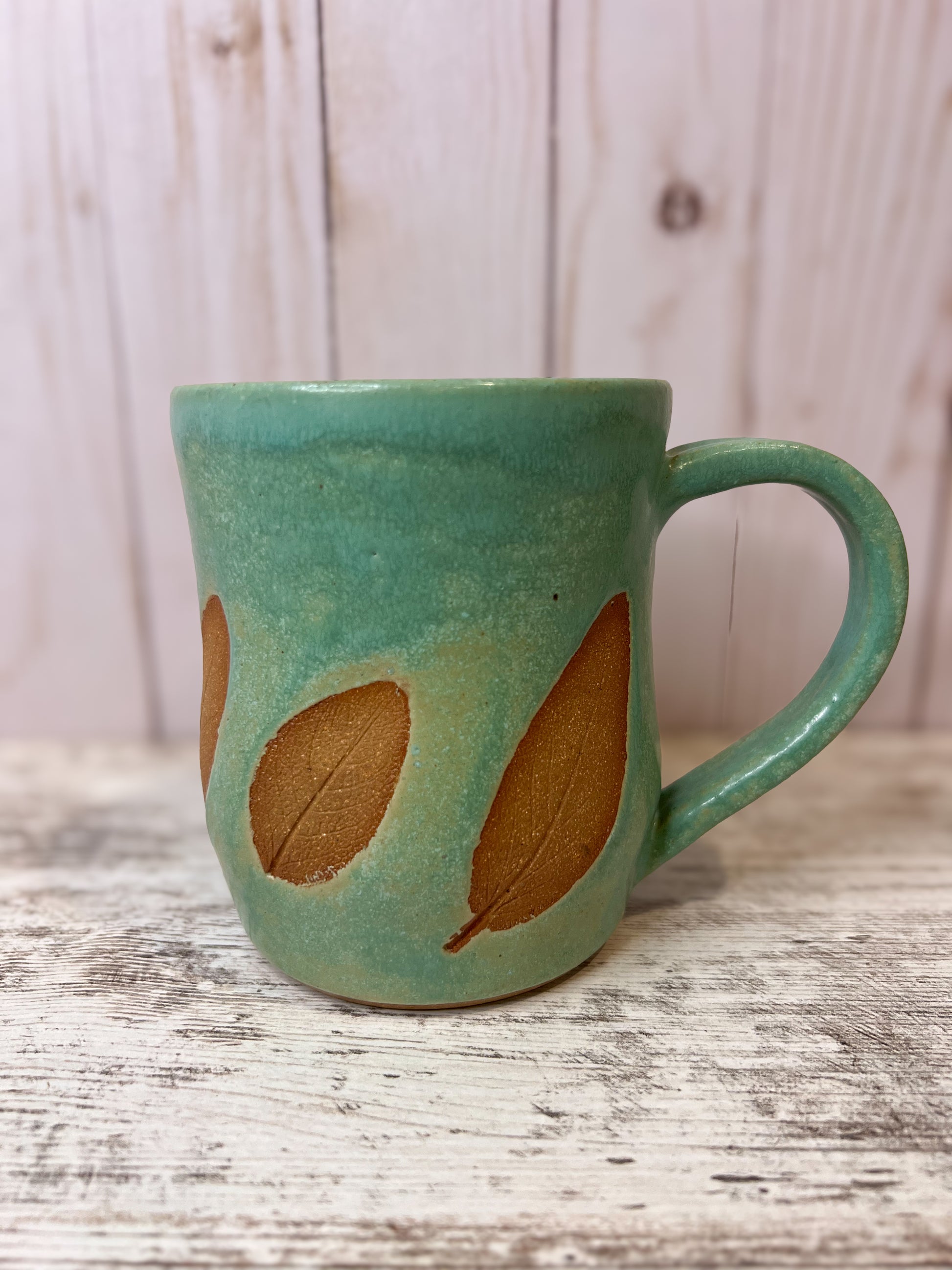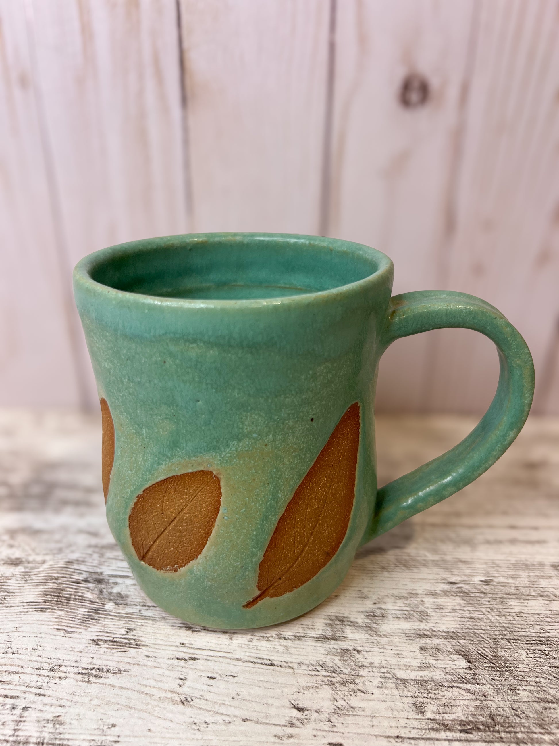 This handmade mug features a distinctive, organic shape with a unique glaze, offering both beauty and functionality in every sip. Sage leaves were used to imprint the leaf pattern on the exterior.