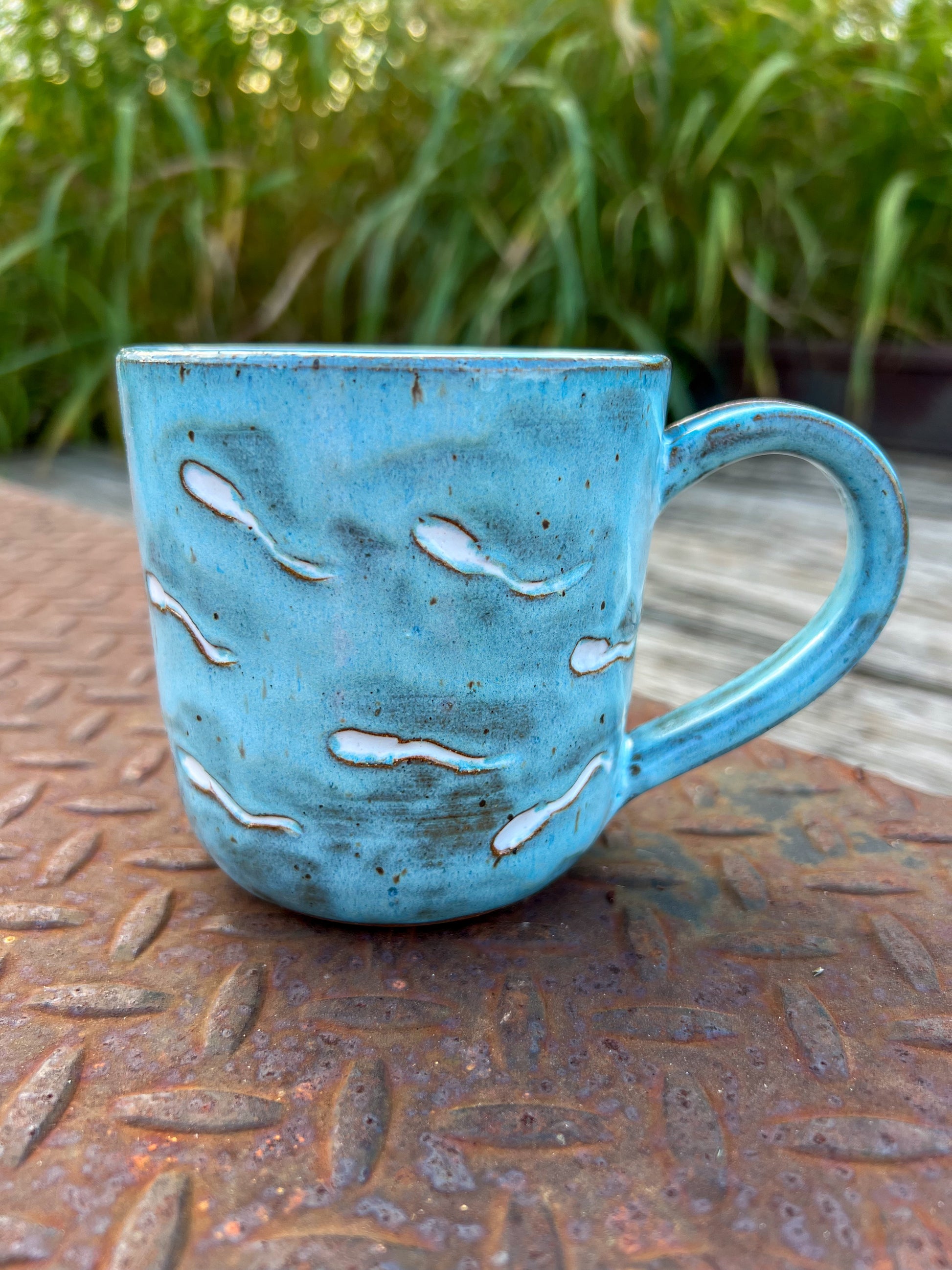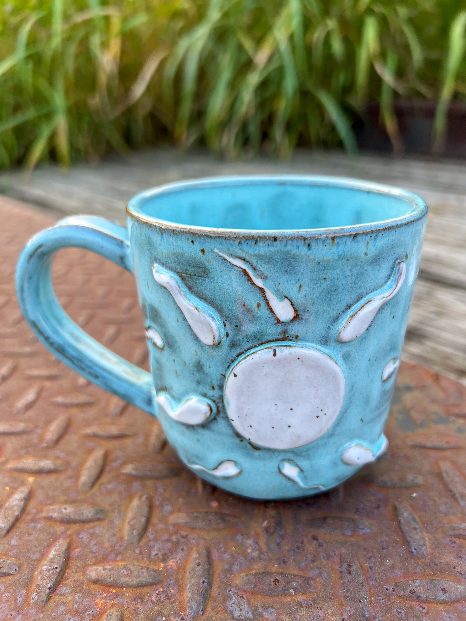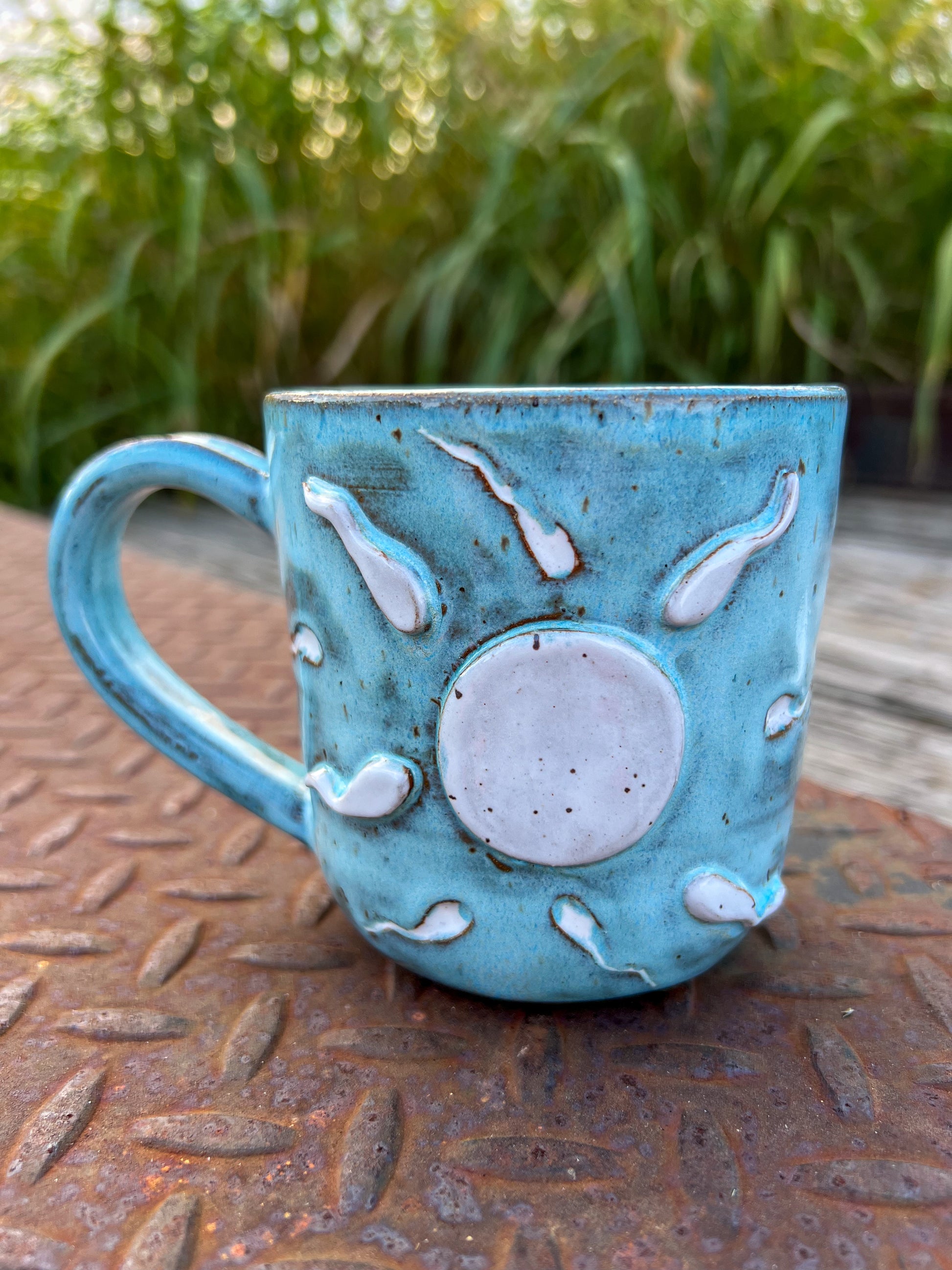 This handmade mug features a distinctive, organic shape with a unique glaze, offering both beauty and functionality in every sip. Mug design features sperm traveling to an egg for fertilization, inspired by my day job as an equine veterinarian.