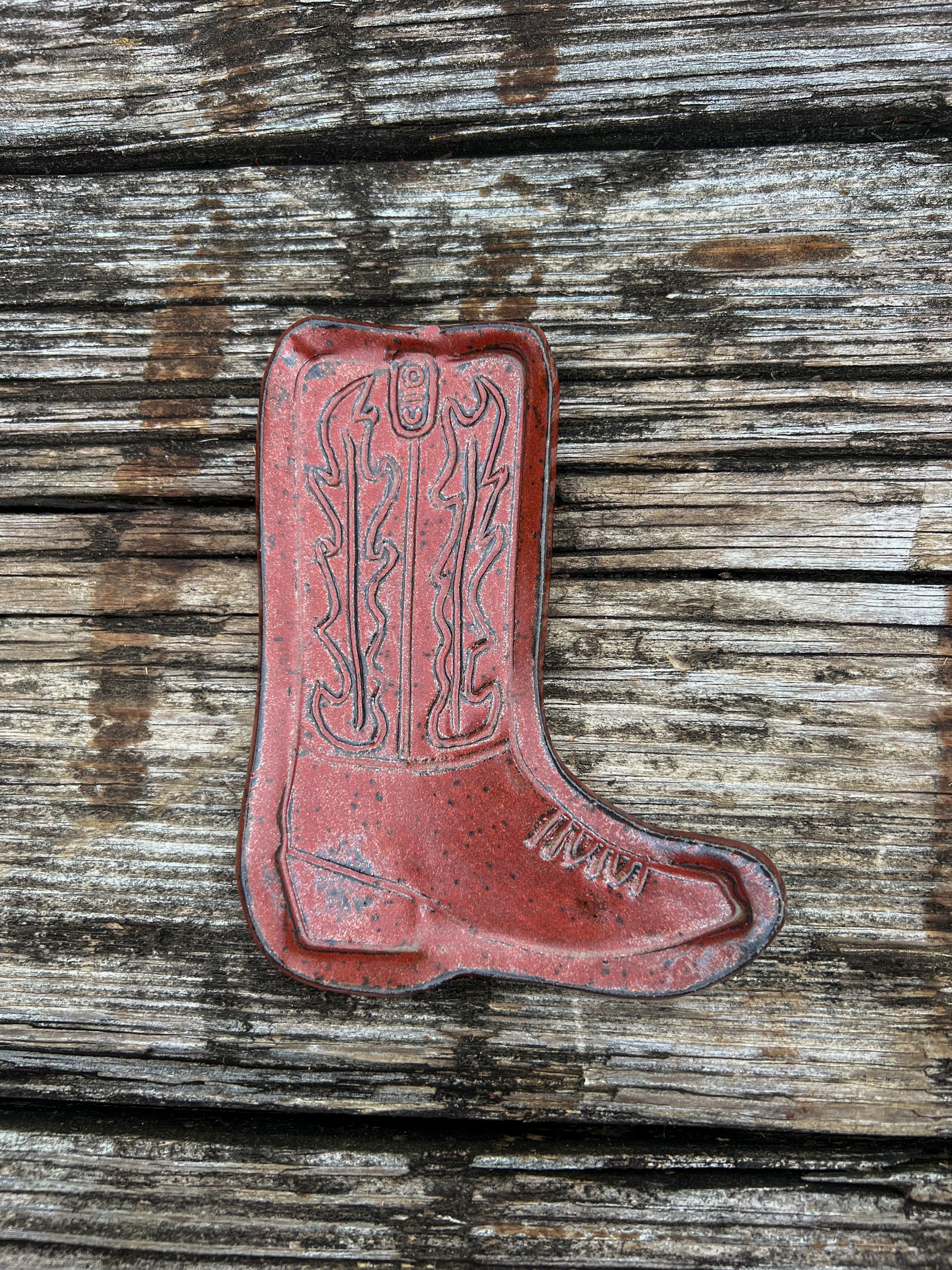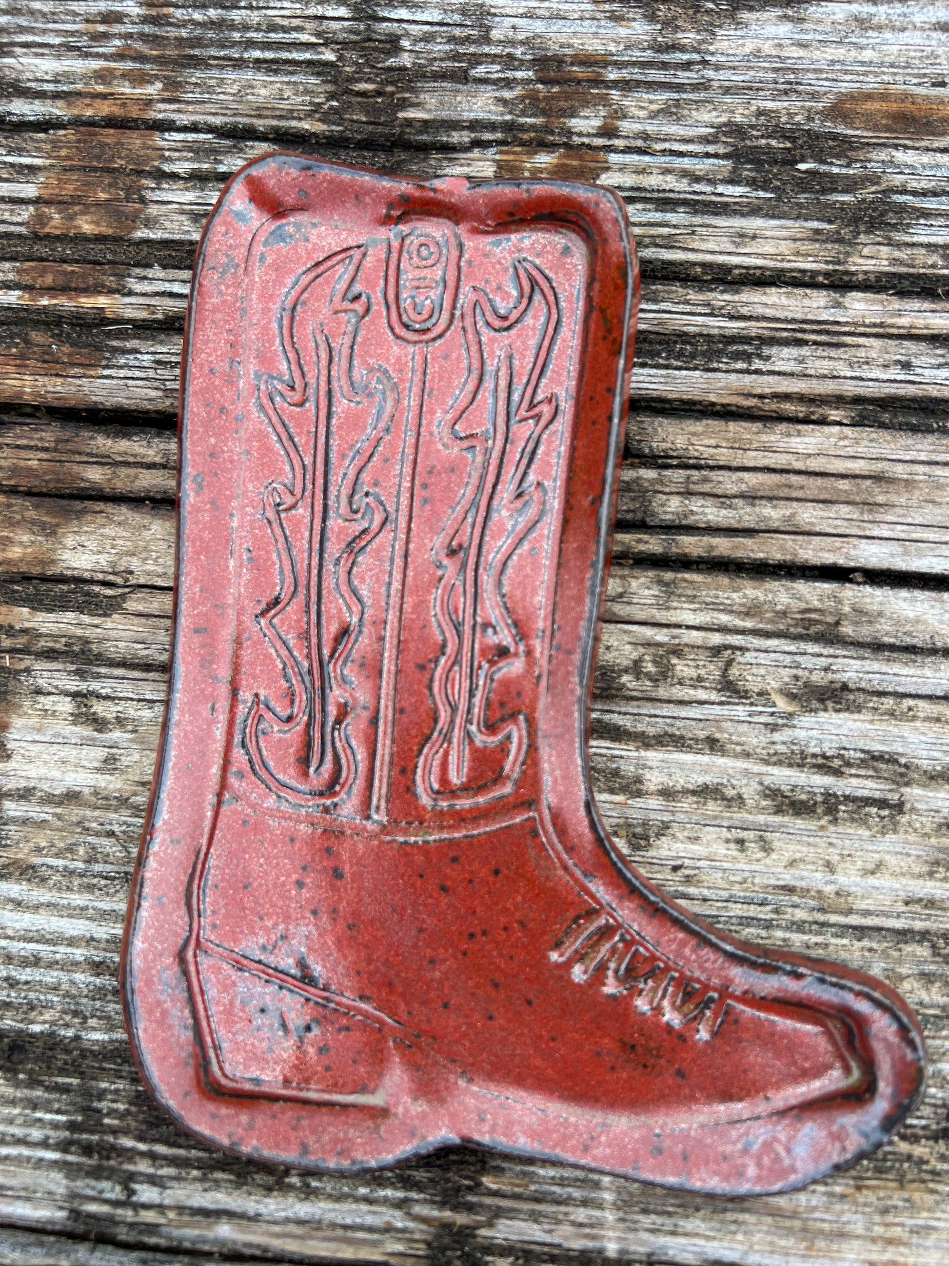 This unique western boot inspired design is perfect for organizing small items like jewelry, rings, keys, etc. The boot stitching is hand carved making each piece unique.