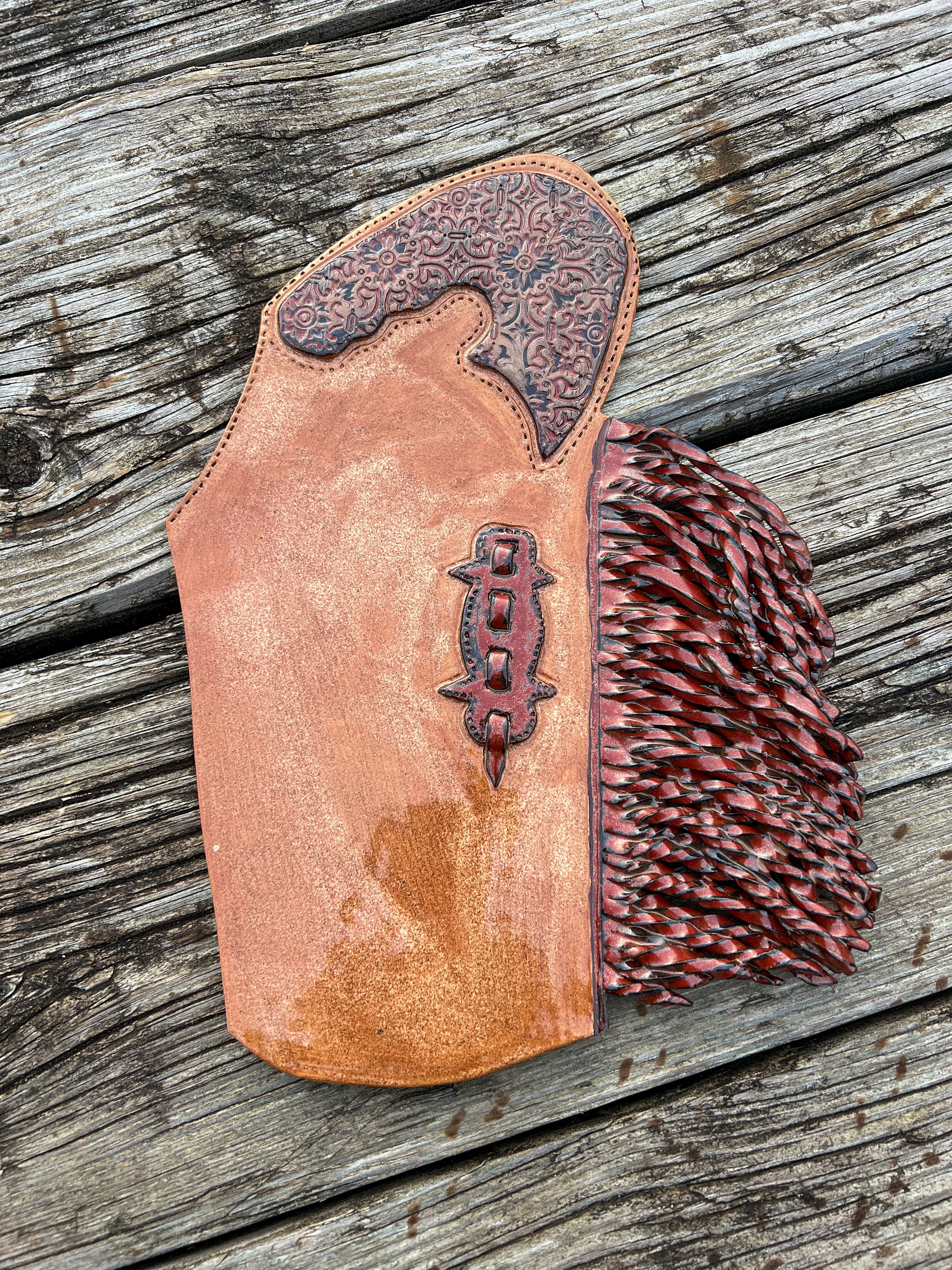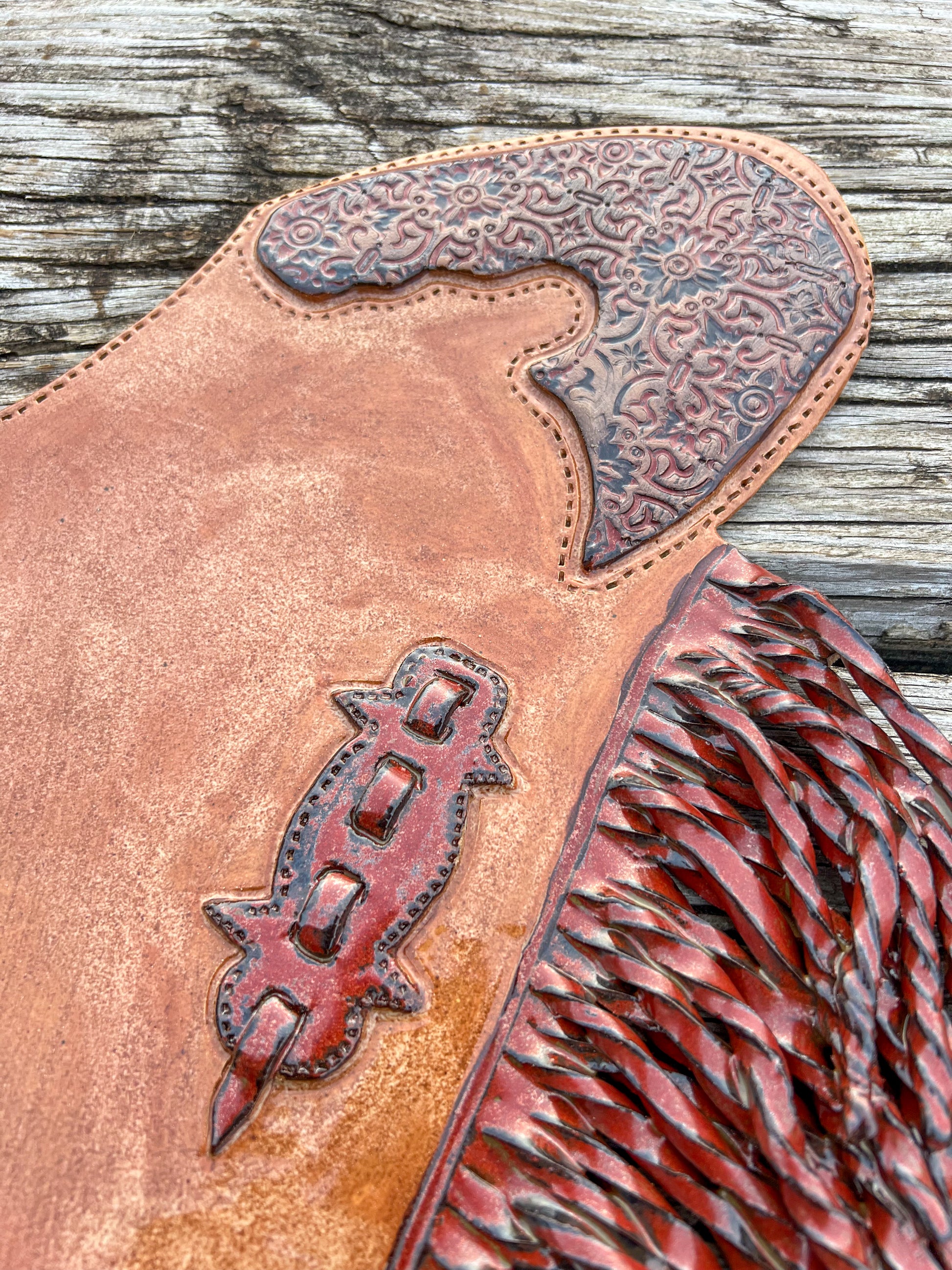 Inspired by western chinks this ceramic charcuterie board offers a sleek surface for arranging cheeses, meats, and fruits. Design includes stitching details and twisted fringe, it doubles as both a functional serving piece and stylish decor.