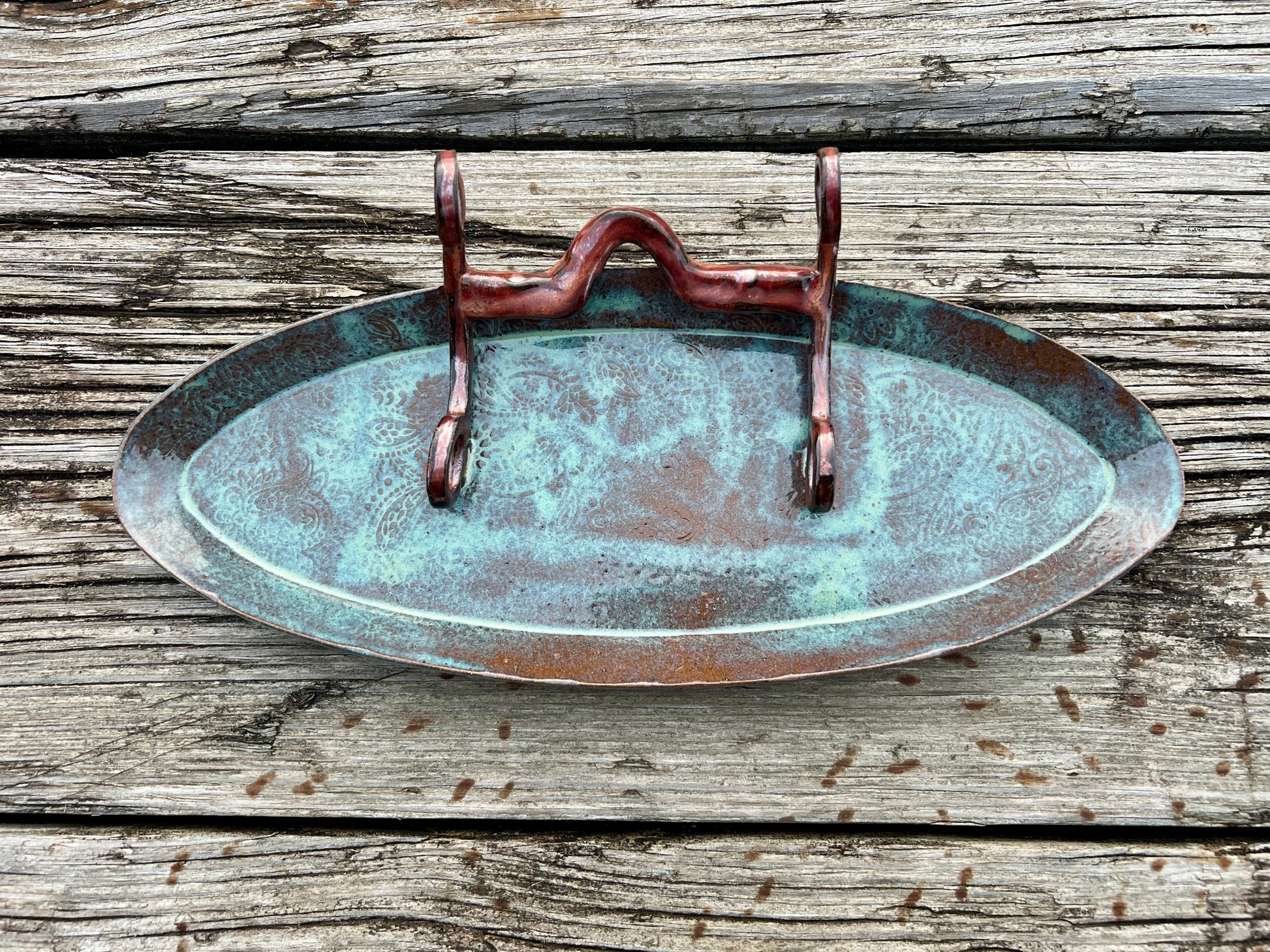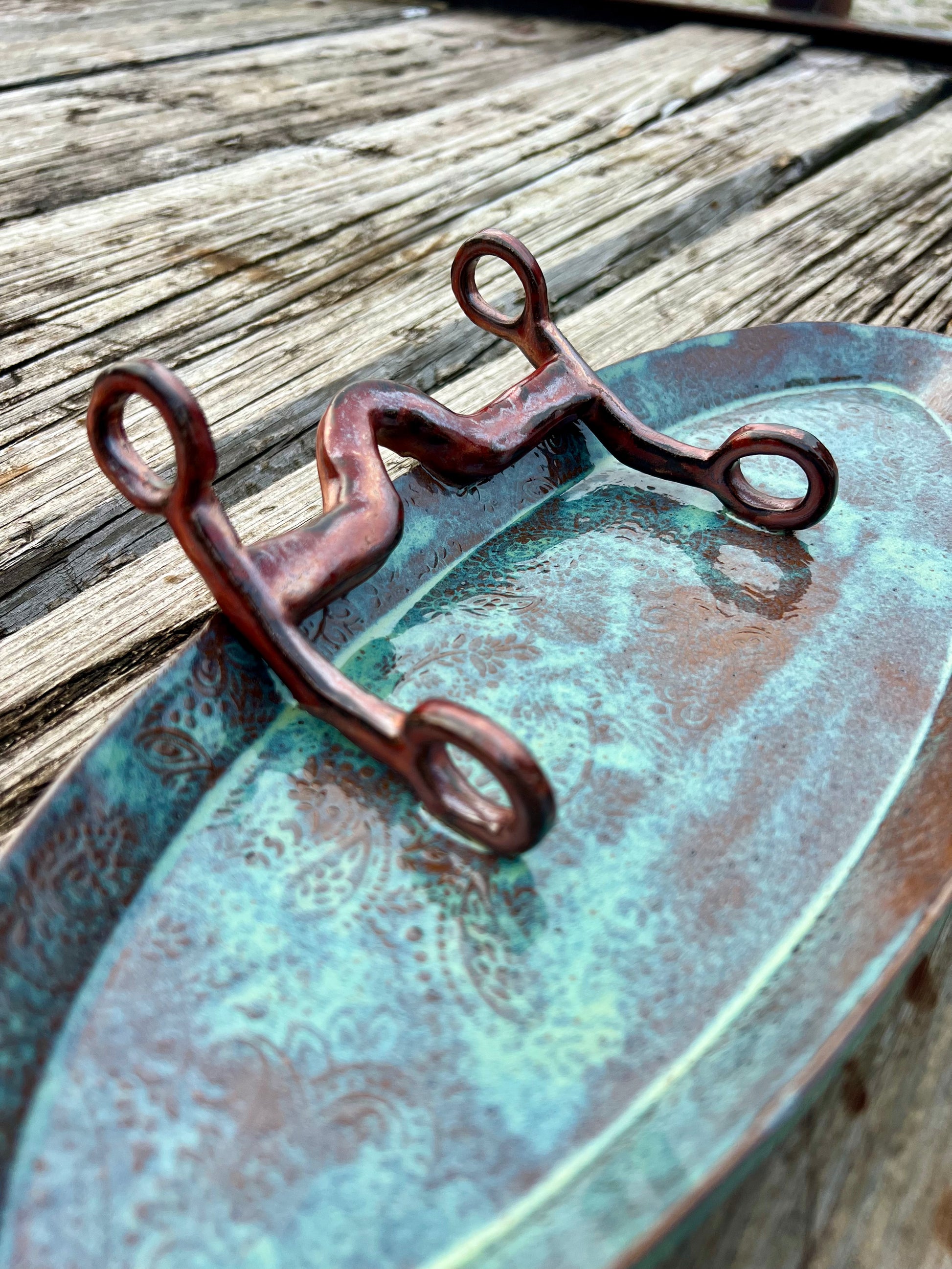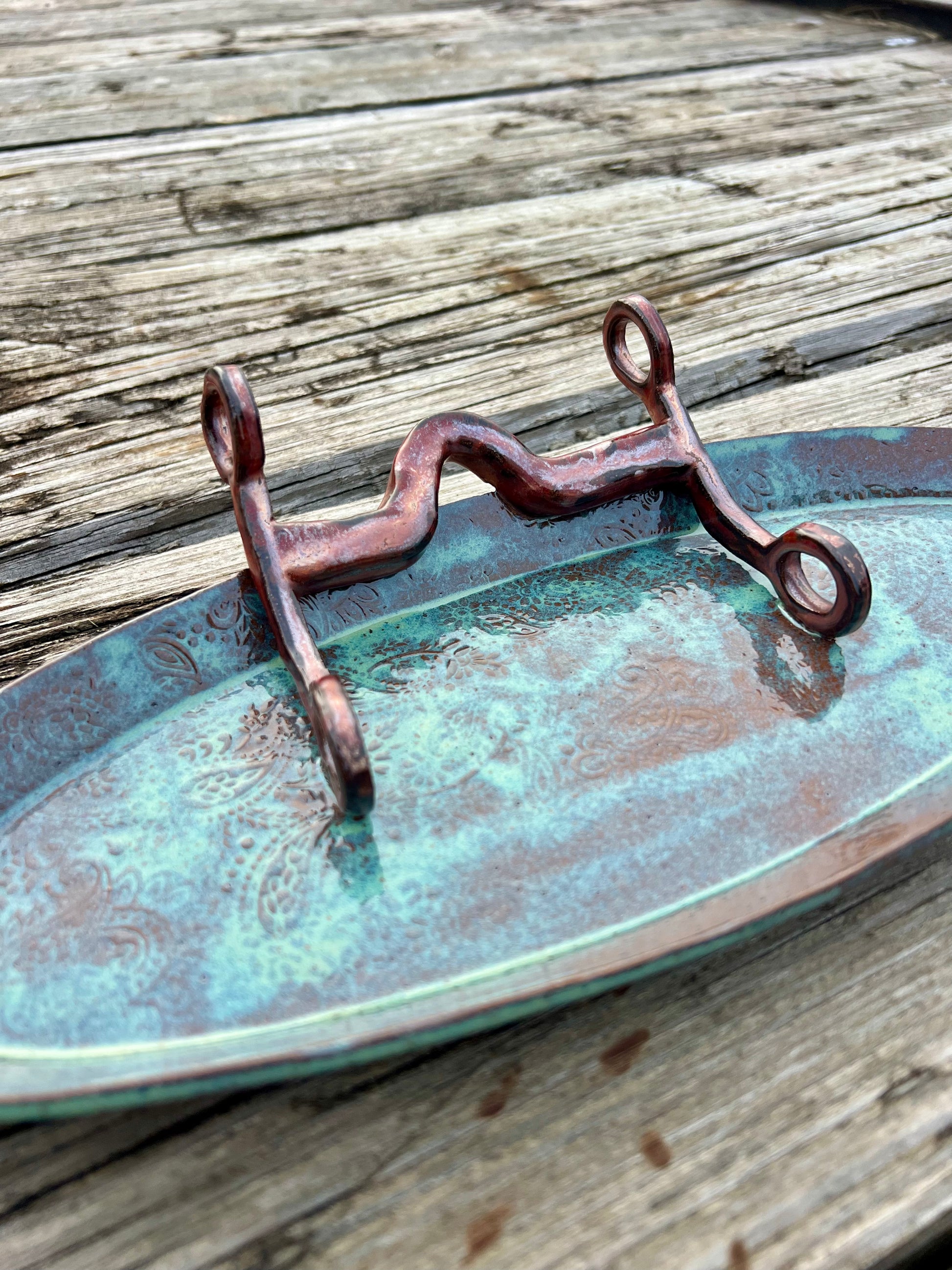 This handmade ceramic decorative plate features a smooth leaf texture on the plate portion. At the center, a horse bit accent gracefully curves across the plate, adding a touch of equestrian elegance. The intricate detailing of the horse bit, glazed to look like a weathered horse bit, contrasts beautifully with the ceramic surface, making it a striking piece for display or as a serving dish.